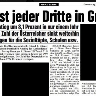 weiterlesenDie Steirerkrone. Hetzig statt herzig. Die Krone macht mal wieder in Angst. Anlass: Die Bevölkerungsstatistik von Graz. Die Krone rechnet dabei vor, dass die heimische Bevölkerung abnimmt und „die Ausländer“ immer mehr werden. Dabei ist einiges nicht nur falsch, sondern auch bösartig verdreht. Erstens vermischt die Krone in der „Story“ und den dazu gelieferten „Symbolbildern“ Sterbedaten, Schulstatistiken und Fakten zur Wohnbevölkerung. Zweitens suggeriert man eine „Ausländerflut“ ohne in Herkunftsländer zu…